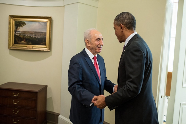 President Barack Obama greets President Shimon Peres of Israel in the hallway outside the Oval Office, June 25, 2014. (Official White House Photo by Pete Souza)