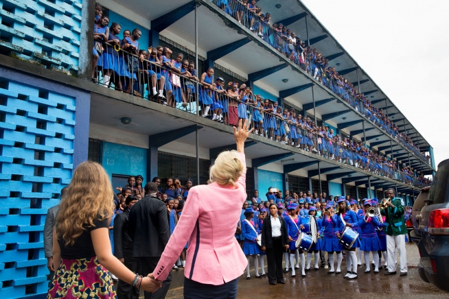 Dr. Jill Biden and granddaughter Finnegan Biden wave goodbye to students assembled on the railings, after a girls education event at the St. Joseph's Secondary School, in Freetown, Sierra Leone, July 7, 2014. (Official White House Photo by David Lienemann)