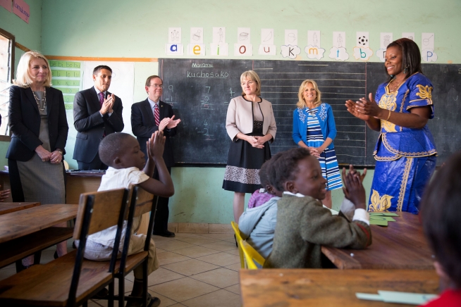 Dr. Jill Biden and Zambian Second Lady Dr. Charlotte visit a classroom at the Shalom Community School, in Lusaka, Zambia, July 2, 2014. Also pictured are (from left) Ambassador Cathy Russell, USAID Administrator Raj Shah, and Chargé d'affaires David Young. (Official White House Photo by David Lienemann)