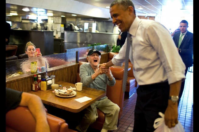 President Barack Obama greets a man who told the President he had voted for him, at Canter's Delicatessen in Los Angeles, Calif., July 24, 2014. (Official White House Photo by Pete Souza)