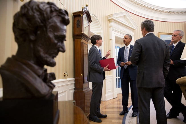 President Barack Obama talks with Council of Economic Advisers Chair Jason Furman, National Economic Council Director Jeffrey Zients and Chief of Staff Denis McDonough in the Oval Office, July 2, 2014. (Official White House Photo by Pete Souza)