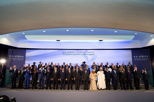 President Barack Obama joins Africa leaders for a group photo during the U.S.-Africa Leaders Summit at the U.S. Department of State in Washington, D.C., Aug. 6, 2014. (Official White House Photo by Chuck Kennedy)