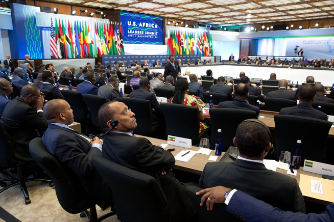 Africa leaders listen as President Barack Obama delivers remarks and participates in the Leaders Session One: “Investing in Africa’s Future” during the U.S.-Africa Leaders Summit at the U.S. Department of State in Washington, D.C., Aug. 6, 2014. (Official White House Photo by Pete Souza)