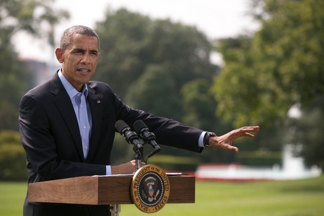 President Barack Obama delivers a statement to the press on the South Lawn of the White House before he departs for Martha's Vineyard, Mass., Aug. 9, 2014.