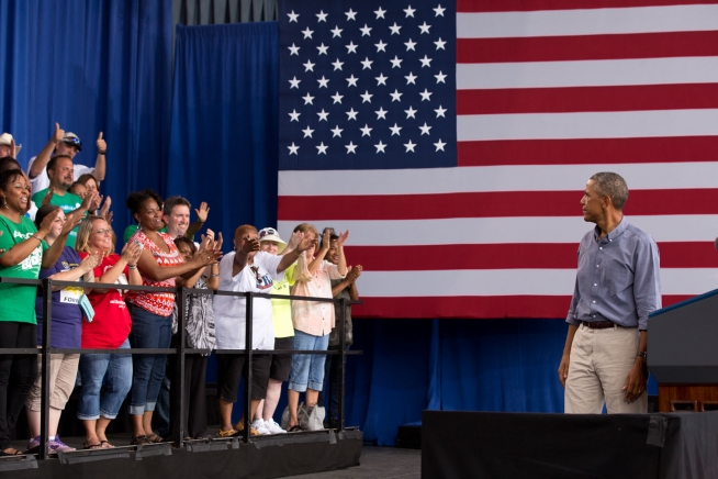 President Barack Obama looks back at the crowd behind him on the stage during remarks at the Milwaukee Laborfest at Henry Maier Festival Park in Milwaukee, Wis., on Labor Day, Sept. 1, 2014.