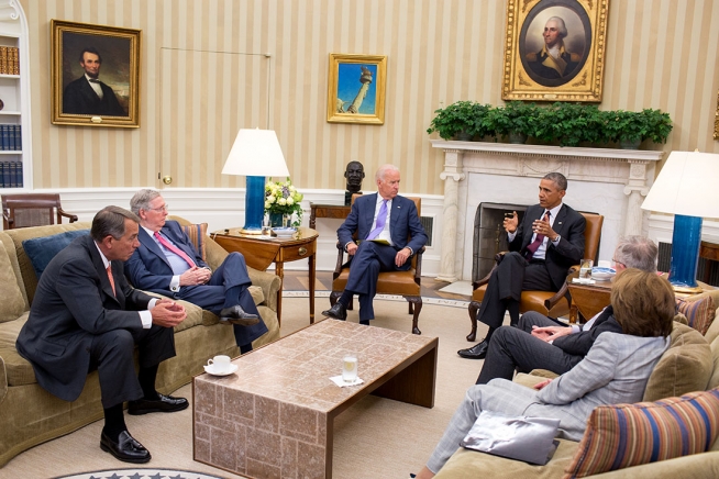 President Barack Obama and Vice President Joe Biden meet with bicameral leadership of Congress regarding foreign policy, in the Oval Office, Sept. 9, 2014. Participants include: Senate Majority Leader Harry Reid, D-Nev., Senate Minority Leader Mitch McConnell, R-Ky., House Speaker John Boehner, R-Ohio and Democratic Minority Leader Nancy Pelosi, D-Calif. (Official White House Photo by Pete Souza)
