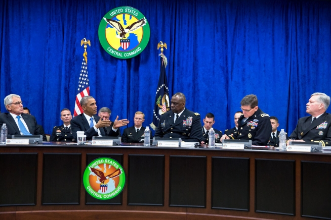 President Barack Obama receives a briefing from Gen. Lloyd J. Austin III, Commander, U.S. Central Command, and his top commanders at U.S. Central Command at MacDill Air Force Base in Tampa, Fla., Sept. 17, 2014. (Official White House Photo by Pete Souza)