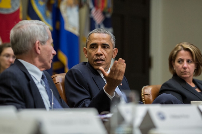 President Barack Obama speaks to Dr. Anthony Fauci, Director of The National Institute of Allergy and Infectious Diseases at the National Institute of Health during a meeting with members of the President's Council of Advisors on Science and Technology regarding Ebola, in the Roosevelt Room of the White House, Oct. 23, 2014. (Official White House Photo by Pete Souza)
