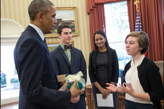 2014 National Youth Network Entrepreneurship Challenge first place winner Lily DeBell, 13, describes her business to President Barack Obama during an Oval Office visit, Nov. 18, 2014. Runner up Jesse Horine, 19, at left and runner up Ambar Romero, 16, visited the President with DeBell. (Official White House Photo by Pete Souza)