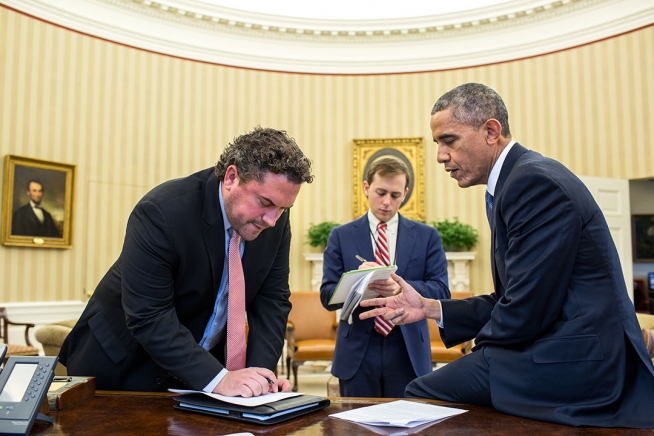 President Barack Obama works on his immigration speech with Director of Speechwriting Cody Keenan and Senior Presidential Speechwriter David Litt in the Oval Office, Nov. 19, 2014. (Official White House Photo by Pete Souza)