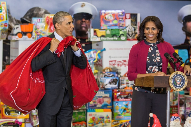 First Lady Michelle Obama, with President Barack Obama carrying in bags of toys, begins her remarks during the Toys for Tots event at Joint Base Anacostia-Bolling in Washington, D.C., Dec. 10, 2014.