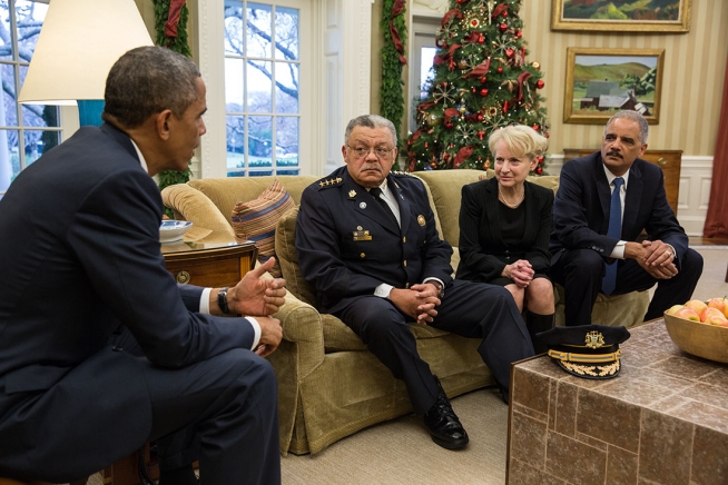 President Barack Obama and Attorney General Eric H. Holder, Jr. meet with Philadelphia Police Commissioner Charles Ramsey and Laurie Robinson, professor of criminology, law and society at George Mason University, and a former assistant attorney general, who will be co-chairing a Presidential task force on how communities and law enforcement can work together to build trust to strengthen neighborhoods across the country, in the Oval Office, Dec. 1, 2014. (Official White House Photo by Pete Souza)
