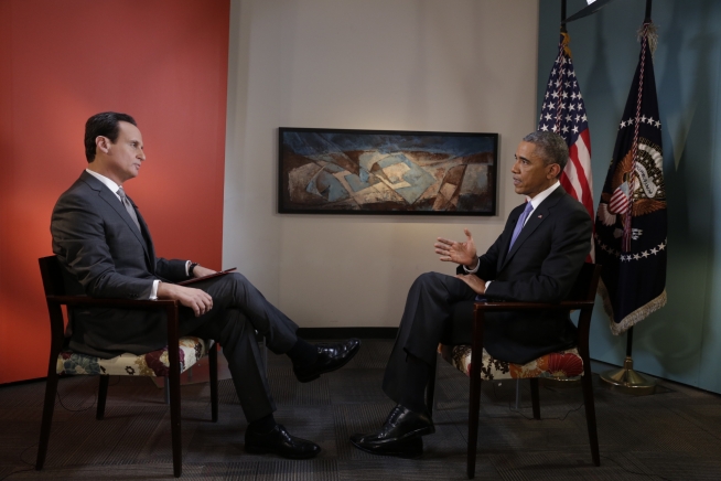 President Barack Obama participates in an interview on immigration with Jose Diaz-Balart of Telemundo at the Casa Azafrán community center in Nashville, Tenn.