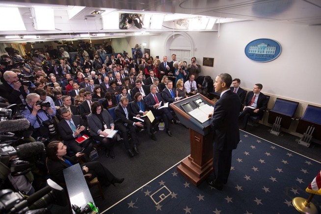 President Barack Obama holds a press conference in the James S. Brady Press Briefing Room of the White House.