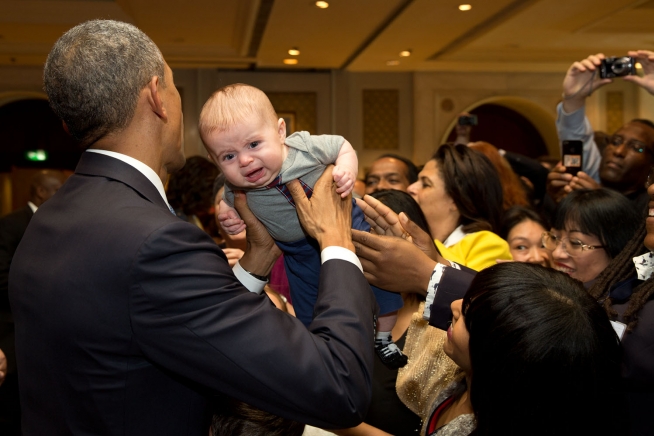 A young baby is not happy as he is pushed forward to greet the President during the U.S. Embassy greet. (Official White House Photo by Pete Souza)