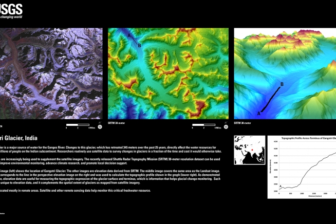 Using the new higher resolution data, these images shows an increased level of detail in mapping the extent of India's Gangotri glacier, including better estimations of its slope and steepness. This can help planners better estimate glacial melt. (Image by USGS/NASA)
