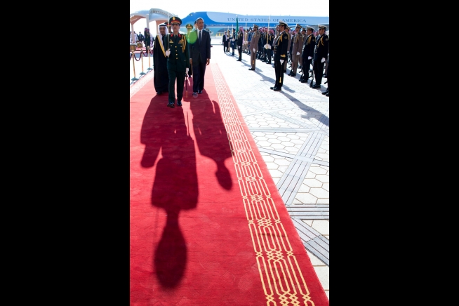 President Barack Obama and King Salman walk along the red carpet at the airport after arriving in Riyadh, Saudi Arabia, Jan. 27, 2015. (Official White House Photo by Pete Souza)