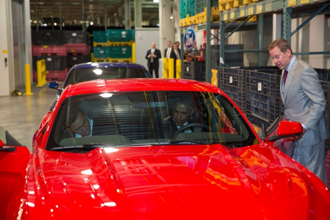 President Barack Obama sits in a Mustang with Ford CEO Mark Fields during a tour of the Ford Michigan Assembly Plant in Wayne, Mich., Jan. 7, 2015. Ford Executive Chairman Bill Ford stands outside the car.
