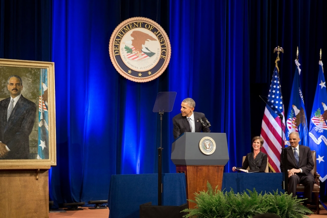 President Barack Obama comments on Attorney General Eric H. Holder, Jr.'s portrait as he delivers remarks during the portrait unveiling ceremony for Holder seated on stage with Sally Quillian Yates, Acting Deputy Attorney General, at the U.S. Department of Justice in Washington, D.C., Feb. 27, 2015.