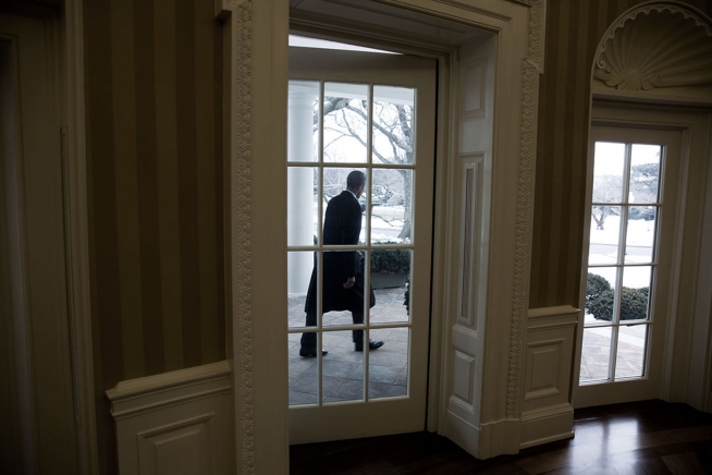 After departing the Oval Office, President Barack Obama walks along the White House Colonnade to board Marine One on the South Lawn en route to Joint Base Andrews, Md., Feb. 25, 2015. The President then flew aboard Air Force One to Miami, Fla., for a town hall on immigration reform at Florida International University. (Official White House Photo by Chuck Kennedy)