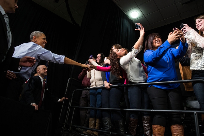 President Barack Obama greets audience members after participating in a town hall on jobs and education at Ivy Tech Community College in Indianapolis, Ind., Feb. 6, 2015. (Official White House Photo by Pete Souza)