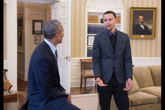 President Barack Obama visits with Golden State Warriors point guard Stephen Curry in the Oval Office, Feb. 25, 2015.