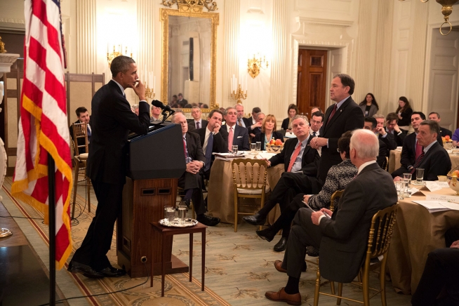 Utah Governor Gary Herbert asks President Barack Obama a question following the President's remarks to the National Governors Association in the State Dining Room of the White House, Feb. 23, 2015.
