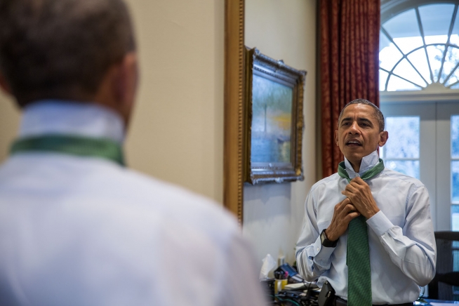 President Barack Obama puts on a green tie in observance of St. Patrick's Day, in the Outer Oval Office, March 17, 2015. (Official White House Photo by Pete Souza)
