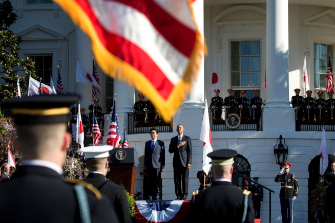 The President and Prime Minister listen to the U.S. national anthem. (Official White House Photo by Chuck Kennedy)