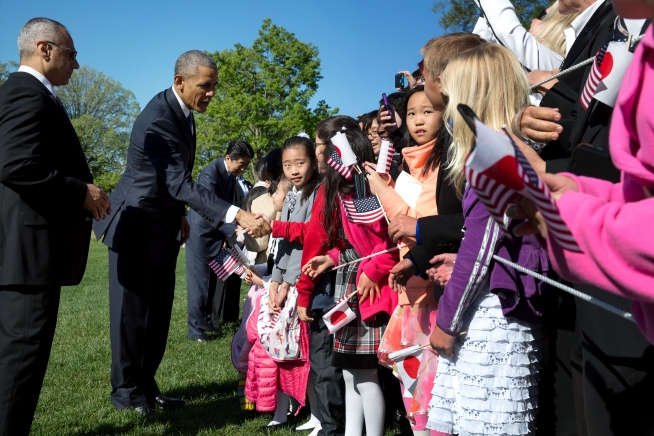 President Obama and Prime Minister Abe greet school children. (Official White House Photo by Pete Souza)