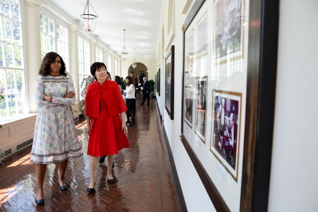 The First Lady and Mrs. Abe view photographs in the East Colonnade. (Official White House Photo by Amanda Lucidon)