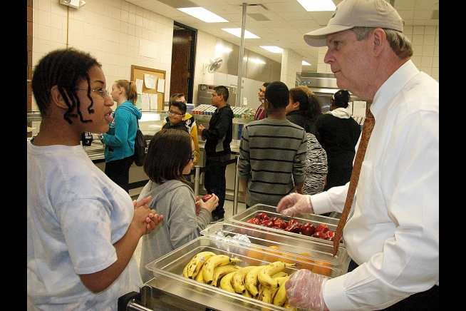 Agriculture Secretary Tom Vilsack serves Des Moines, IA McCombs Middle School student Miracle Kizer