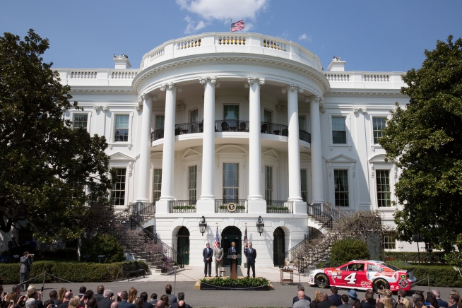President Barack Obama delivers remarks during an event to honor Kevin Harvick and his Stewart-Haas Racing team members and their 2014 NASCAR Sprint Cup Series championship, on the South Lawn of the White House, April 21, 2015. From left: Team owner Tony Stewart, Harvick's crew chief Rodney Childers, and Kevin Harvick.