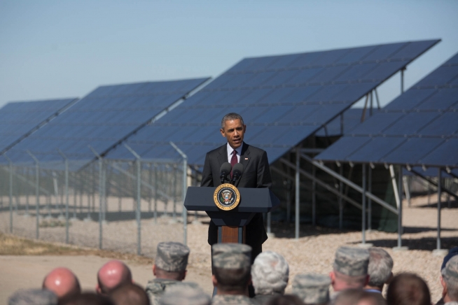 President Obama delivers remarks in front of a solar array at Hill Air Force Base in Layton, Utah