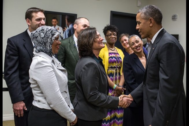 President Barack Obama greets stage participants in the Eisenhower Executive Office Building South Court Auditorium Vestibule prior to a Champions of Change event, April 16, 2015.