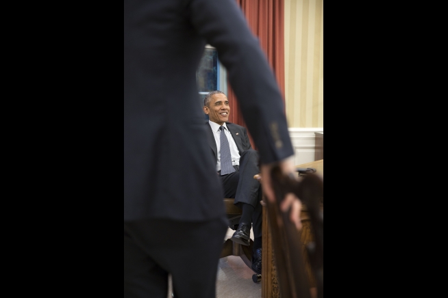President Barack Obama holds a meeting in the Oval Office to discuss the Senate cloture vote on trade promotion authority before its passage, May 21, 2015. (Official White House Photo by Pete Souza)
