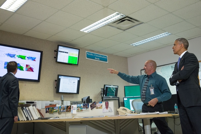 President Barack Obama tours the Tropical Analysis and Forecast Branch of the National Hurricane Center in Miami, Fla. May 28, 2015. Branch Chief Hugh Cobb provides an overview. Dr. Rick Knabb, Director of the National Hurricane Center, leads the tour.