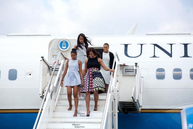 Mrs. Obama arrives with daughters Sasha and Malia, and niece Leslie Robinson in Milan, Italy. (Official White House Photo by Amanda Lucidon)