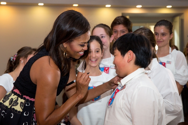 The First Lady autographs a student’s apron after a “Let’s Move” cooking demonstration. (Official White House Photo by Amanda Lucidon)