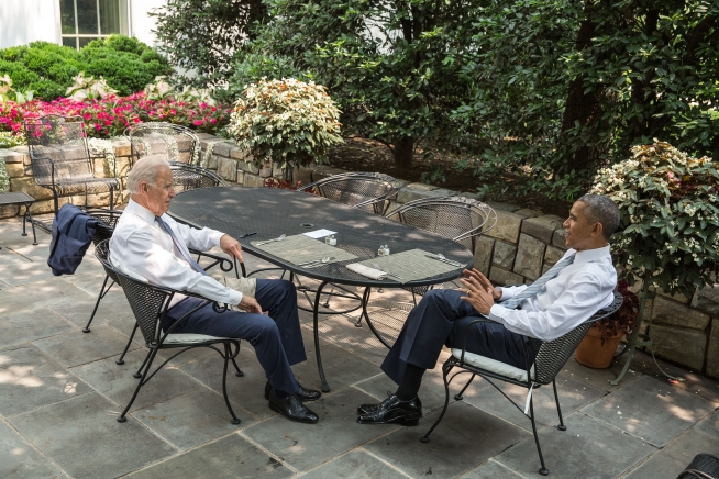 President Barack Obama and Vice President Joe Biden talk before lunch is served on the patio outside the Oval Office, June 10, 2015. (Official White House Photo by Pete Souza)