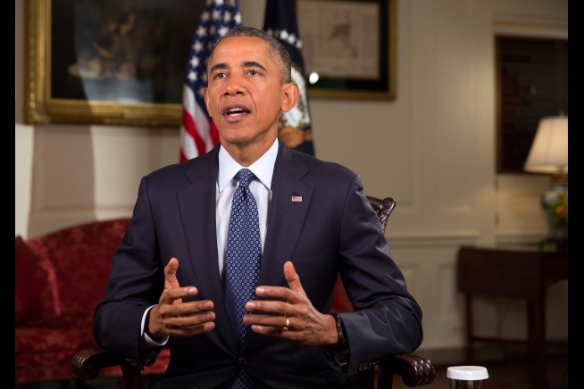 President Barack Obama tapes the Weekly Address in the Map Room of the White House.
