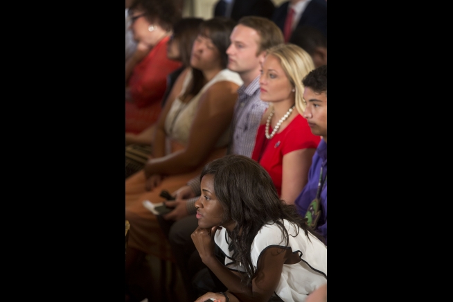 Participants listen to panelists, including First Lady Michelle Obama, during the 2015 Beating the Odds Summit, part of the Reach Higher Initiative, in the East Room of the White House, July 23, 2015.