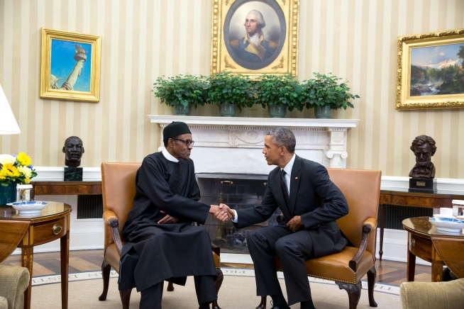 President Barack Obama and President Muhammadu Buhari of Nigeria shake hands before their bilateral meeting in the Oval Office