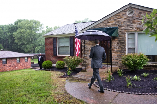 President Barack Obama arrives at the home of Kelly Bryant in the Madison neighborhood of Nashville, Tenn., July 1, 2015. Bryant introduced the President prior to his remarks on the Affordable Care Act (ACA) at Taylor Stratton Elementary School in Nashville. (Official White House Photo by Pete Souza)