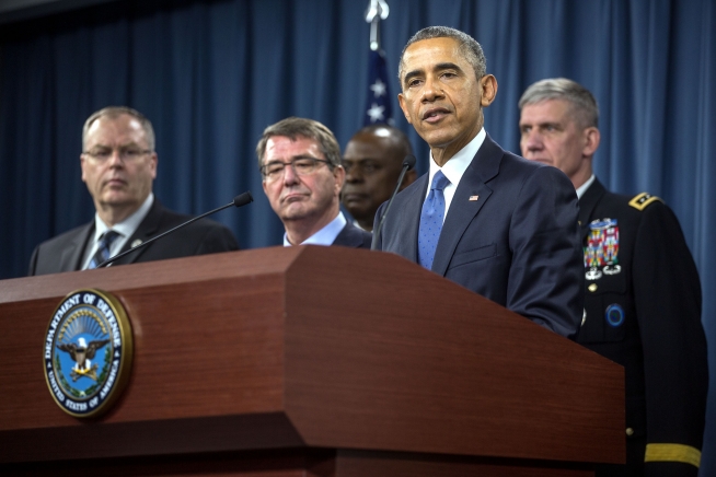 President Barack Obama delivers a statement and answers a few questions from the press following his meeting with Defense Department and military leadership regarding the campaign against ISIL, at the Pentagon, Arlington, Va., July 6, 2015. July 6, 2015.
