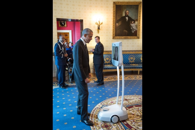 President Barack Obama greets Alice Wong, Disability Visibility Project Founder and Project Coordinator via robot during the Americans with Disabilities Act 25th Anniversary reception in the Blue Room of the White House, July 20, 2015. (Official White House Photo by Pete Souza)