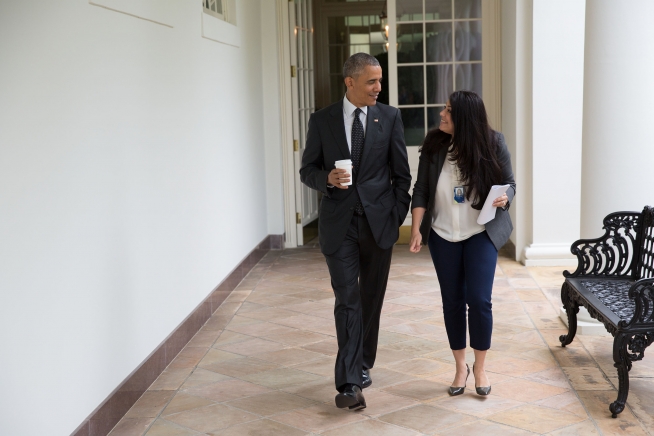 President Barack Obama walks with Personal Secretary Ferial Govashiri along the West Colonnade of the White House, Aug. 7, 2015. (Official White House Photo by Lawrence Jackson)