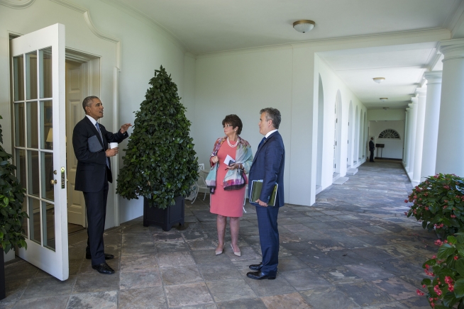 President Barack Obama talks with National Economic Council Director Jeffrey Zients and Senior Advisor Valerie Jarrett on the White House Colonnade after returning from the Business Roundtable Headquarters in Washington, D.C., Sept. 16, 2015. (Official White House Photo by Pete Souza)