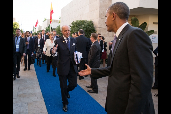 President Barack Obama welcomes Foreign Minister Laurent Fabius of France before meeting with European leaders on the sidelines of the G20 Summit in Antalya, Turkey, to discuss the terrorist attacks in Paris, Nov. 16, 2015. (Official White House Photo by Pete Souza)