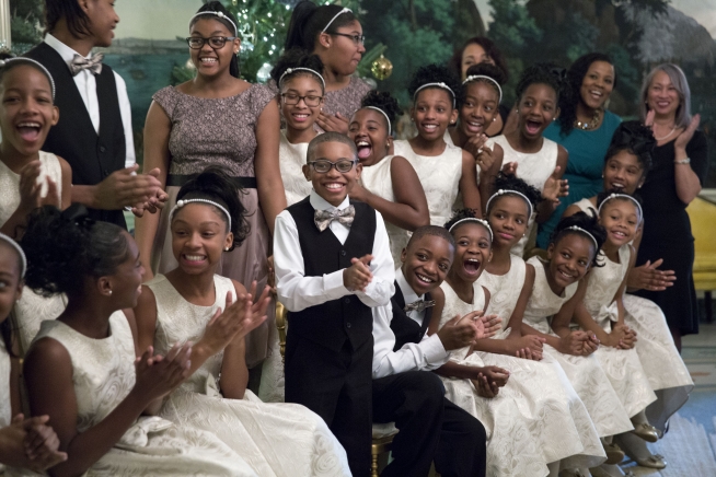 Members of Detroit Academy of Arts and Sciences Show Choir react as President Barack Obama and First Lady Michelle Obama join them in the Diplomatic Reception Room of the White House, prior to a Christmas Holiday reception, Dec. 4, 2015. (Official White House Photo by Pete Souza)
